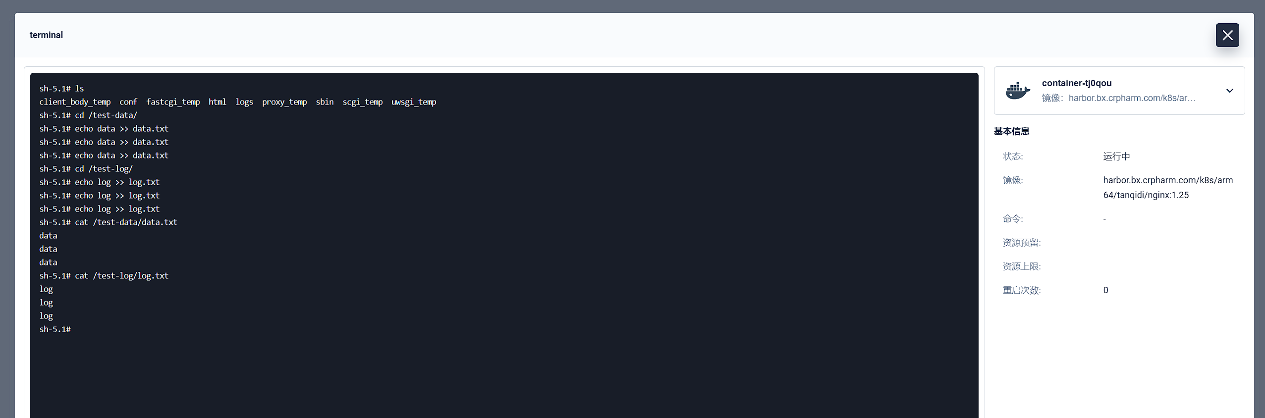 我在 test 命名空间中通过 nfs-client CSI 创建了两个 PVC:test-pvc 和 test-pvc-log,并将它们挂载到 test-nginx Deployment 的 /test-data 和 /test-log 目录下,随后分别往目录中写入了数据。以它来测试备份与还原是否能达到预期